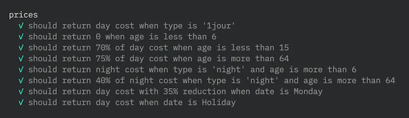 - ✅ type=“1jour” & age = 15 & date is Monday => then cost is 65% of day cost