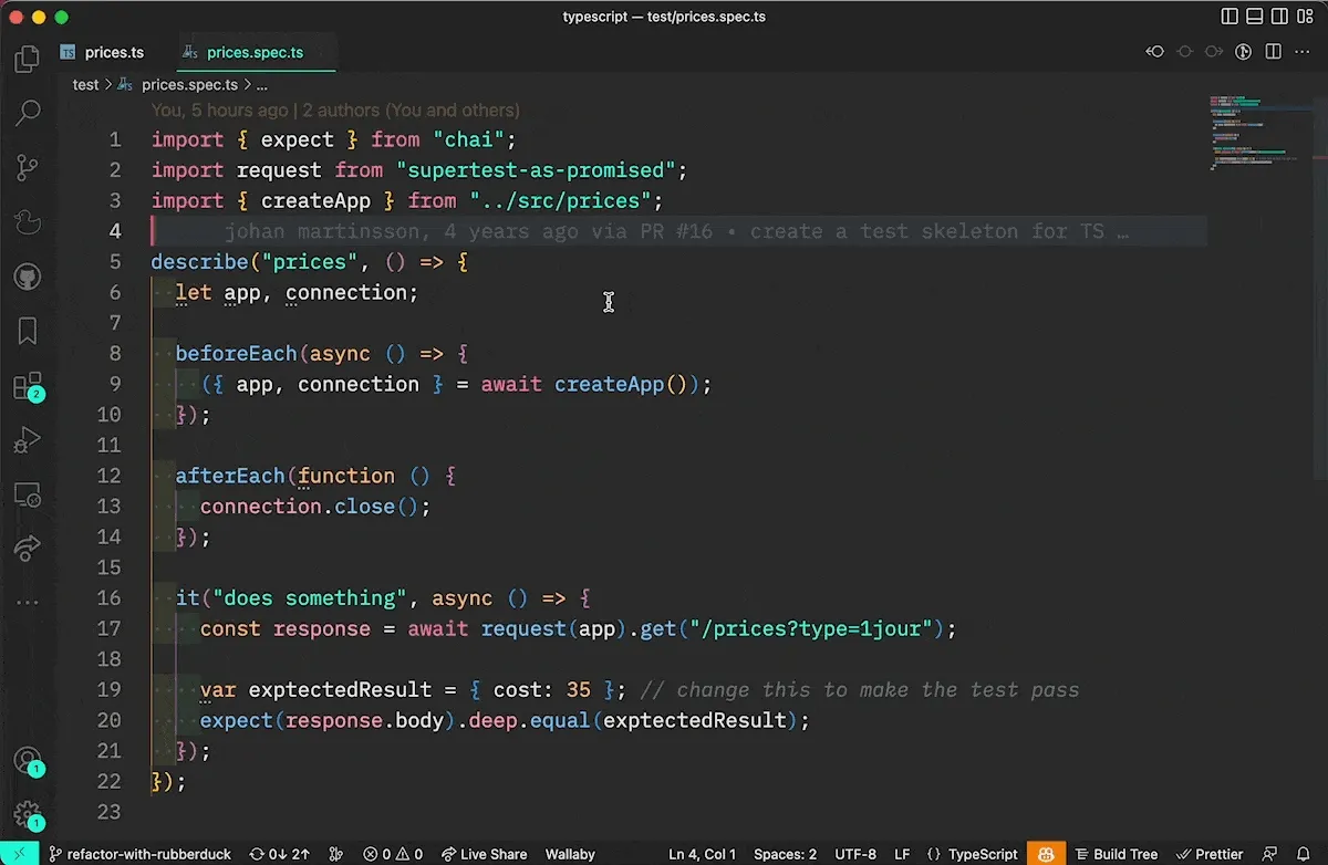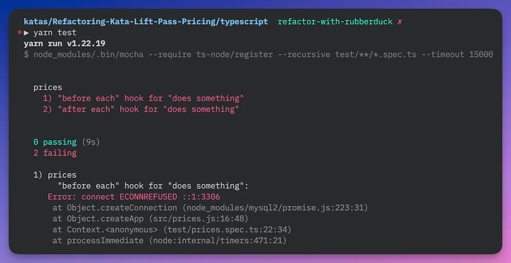 supertest-as-promisedto run HTTP queries against the top-level applicationtestcontainersto set up the database and get it to run in the tests (it’s based on Docker)- A script to fill the database with tests data (these are already provided in the kata)