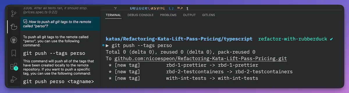 At some point, I couldn’t remember the git syntax to push the tags to that specific remote… So I just open a new Rubberduck chat and asked. It gave me the command I was looking for. All of that without leaving VS Code ❤️