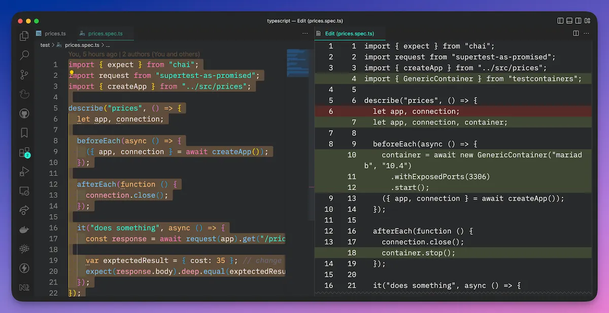 GenericContainer("mariadb:10.4"), not passing two arguments. Hopefully, TypeScript will catch that easily. - I wanted the container to be started before ALL tests and stopped after ALL tests. Doing it between each test is unnecessary and costly. AI didn’t listen to my instructions here.