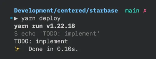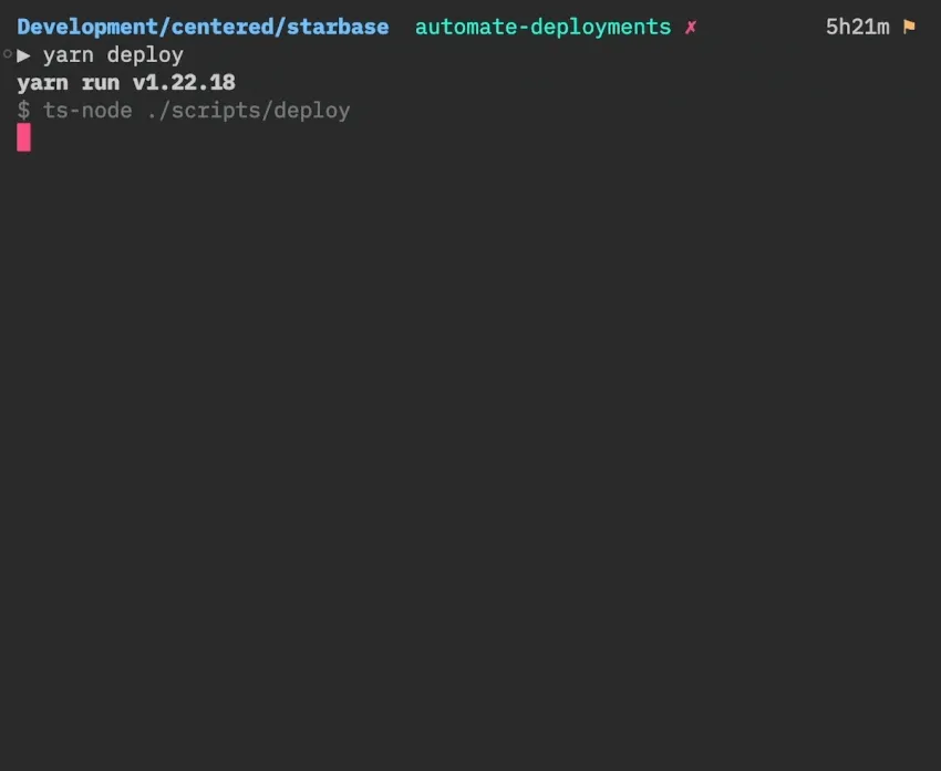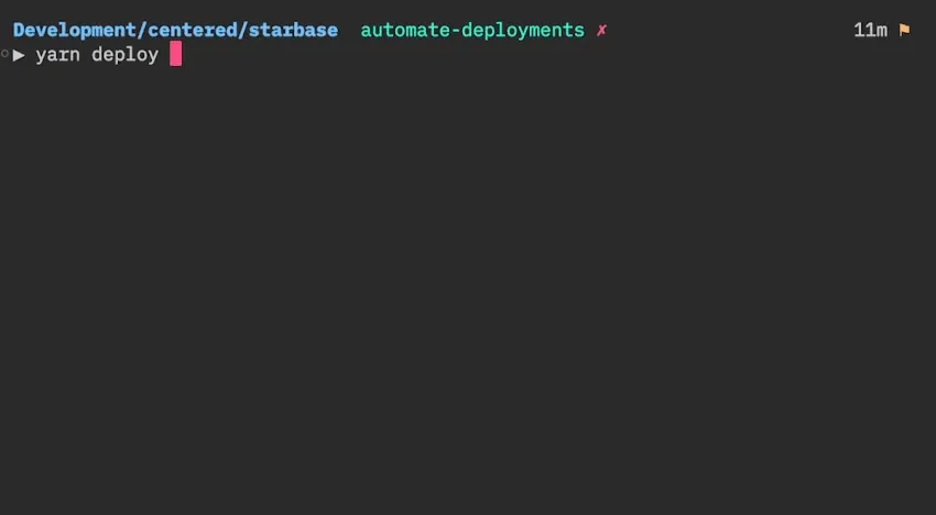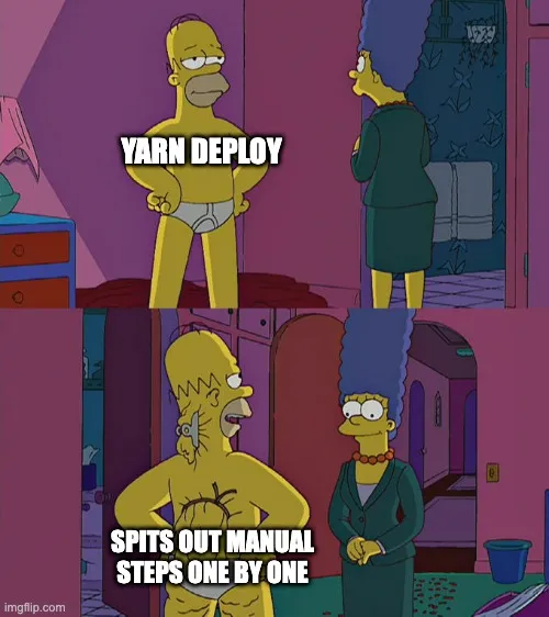 I’ll reduce the scope of all of this and aim to have a single command (yarn deploy) that will simply prompt the instructions to deploy with basic interactions (wait for user confirmation, ask choice questions, etc.).